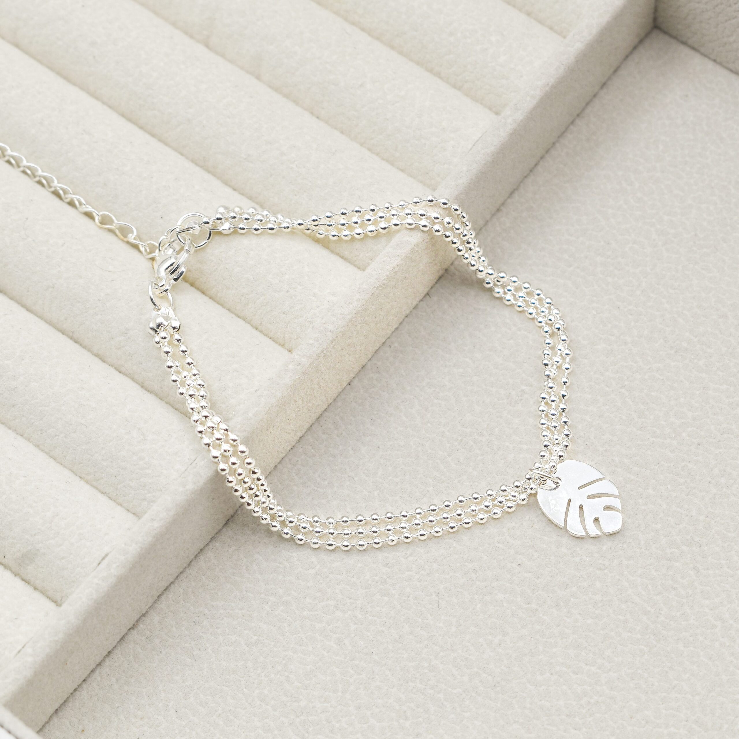 3. PULSERA ACERO BLANCO TRIPLE MICROBOLITA C/1 DIJE DE HOJA