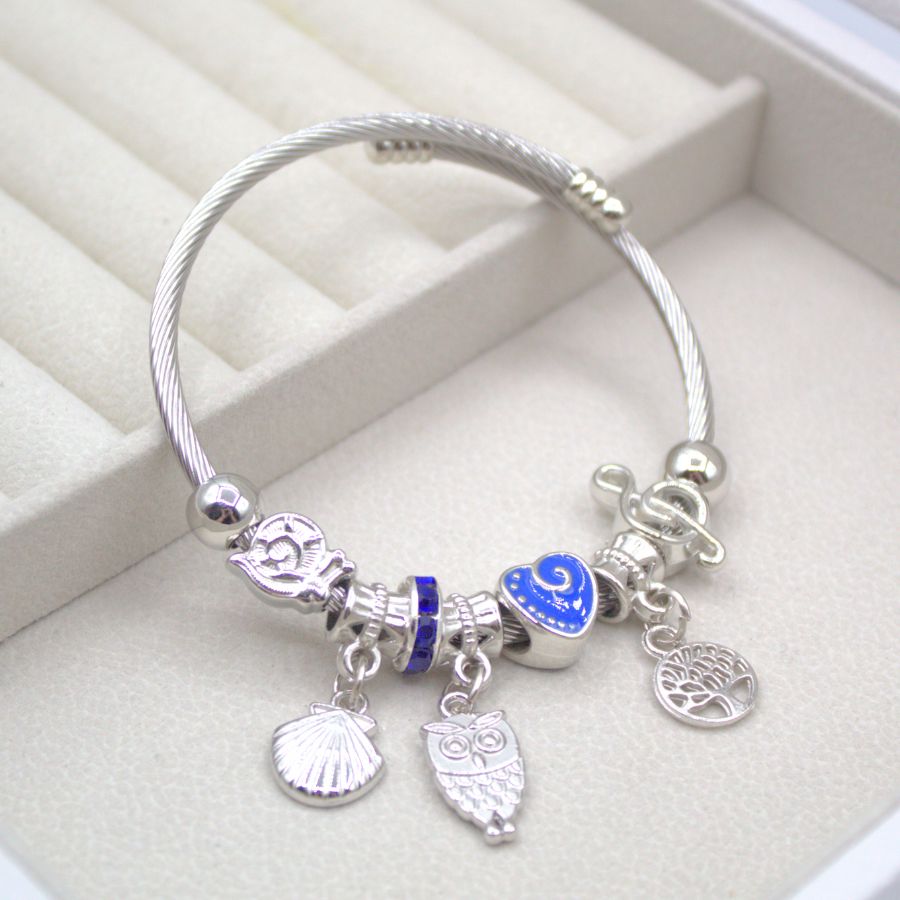 PULSERA TIPO PANDORA PLATEADA AZUL C/ DIJE DE BUHO